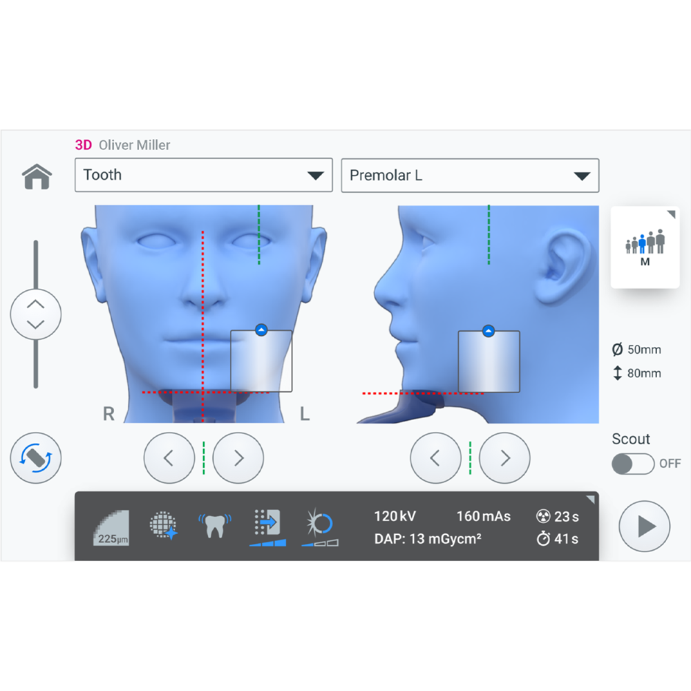 Planmeca Viso G1 med volymstorlekar från 3x3 – 11x11 cm skiljer sig lite mot resten av Viso familjen. Den kommer med ett förenklat lasersystem för snabb och smidig positionering. Volymen väljs direkt från den virtuella patienten på displayen och kan finjusteras fritt på scoutbilden.