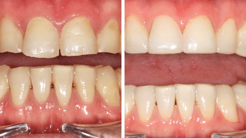 Kollage av bild 1a, före-op, och 1b, Filtek Easy Match.